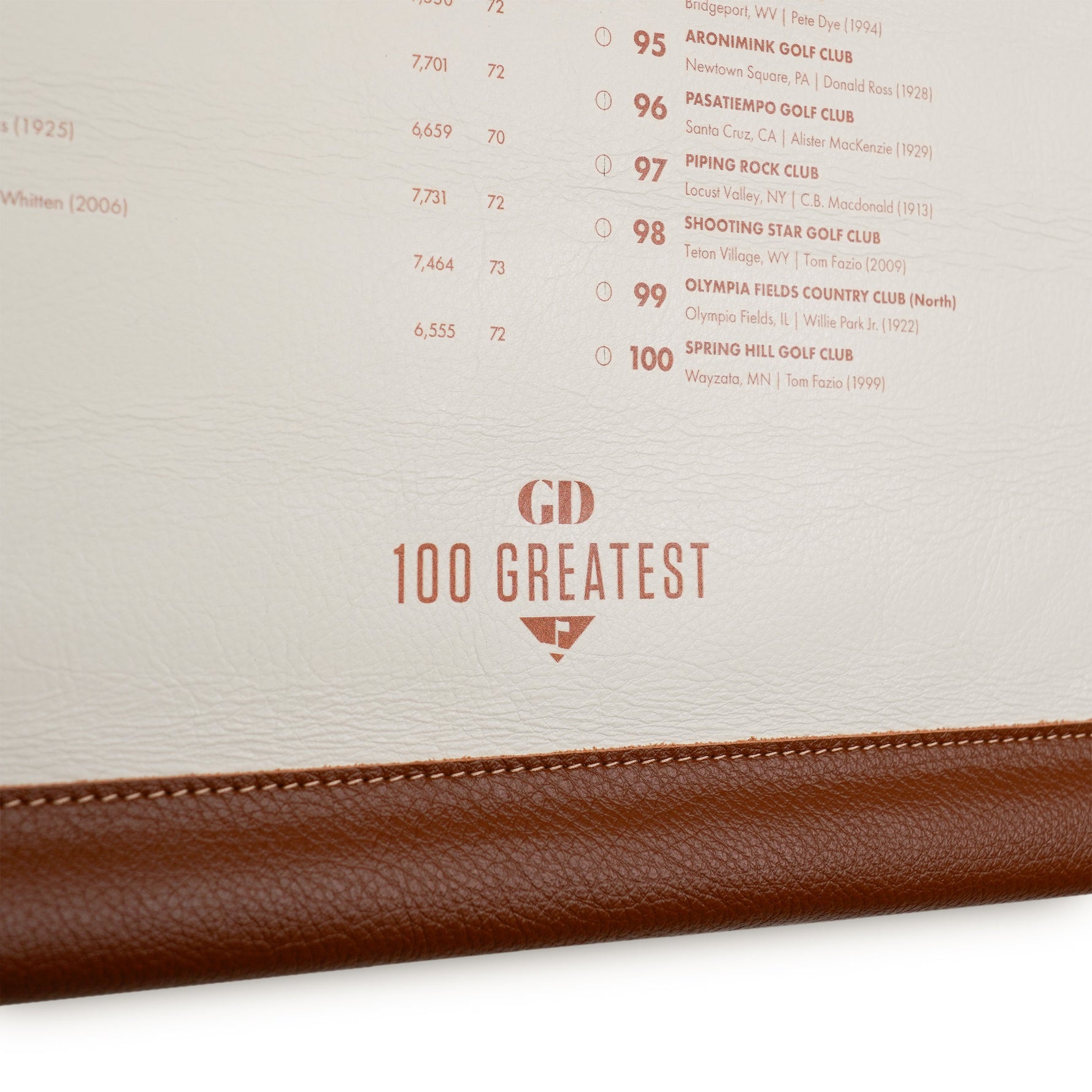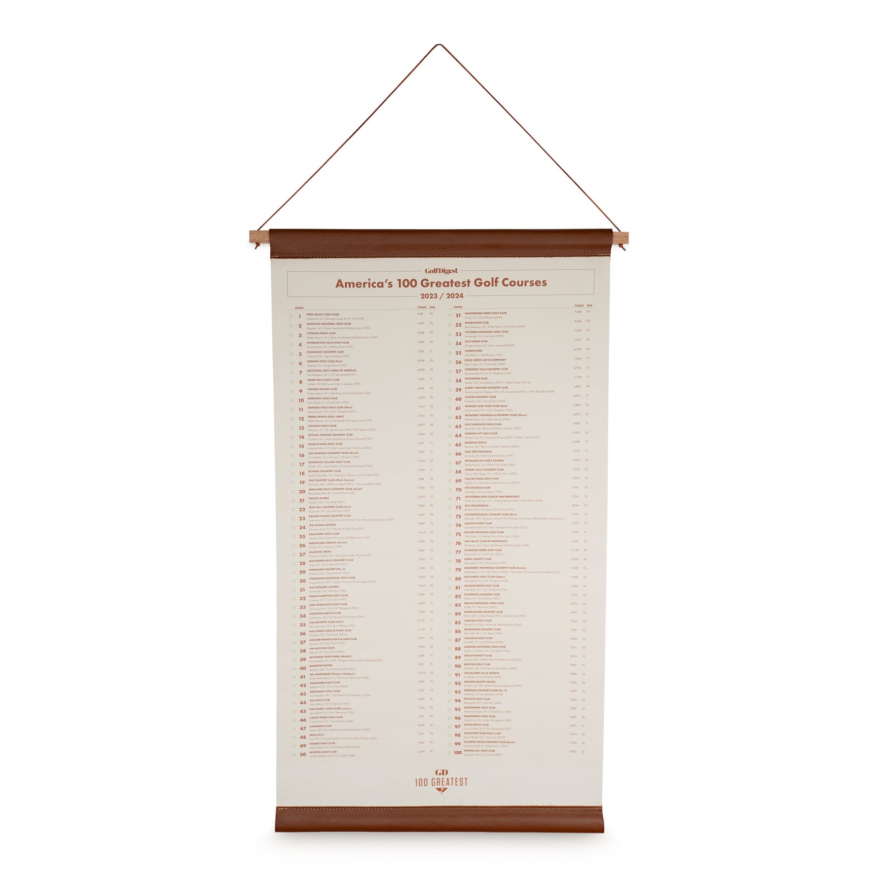 In collaboration with Golf Digest, we present the 2023-24 100 Greatest Courses Leather Scroll. Made from a rich Bone Moto Leather. All course and ranking information is printed in brown and trimmed with a chestnut Tribeca leather. This scroll is perfect to display in your office or house and includes Hickory Wood Dowels and round leather cording for an easy display set up. Have you already played some of these beauties? Check them off your bucket list and mark them on the scroll with the included brads which can be easily applied to the pre-cut holes.