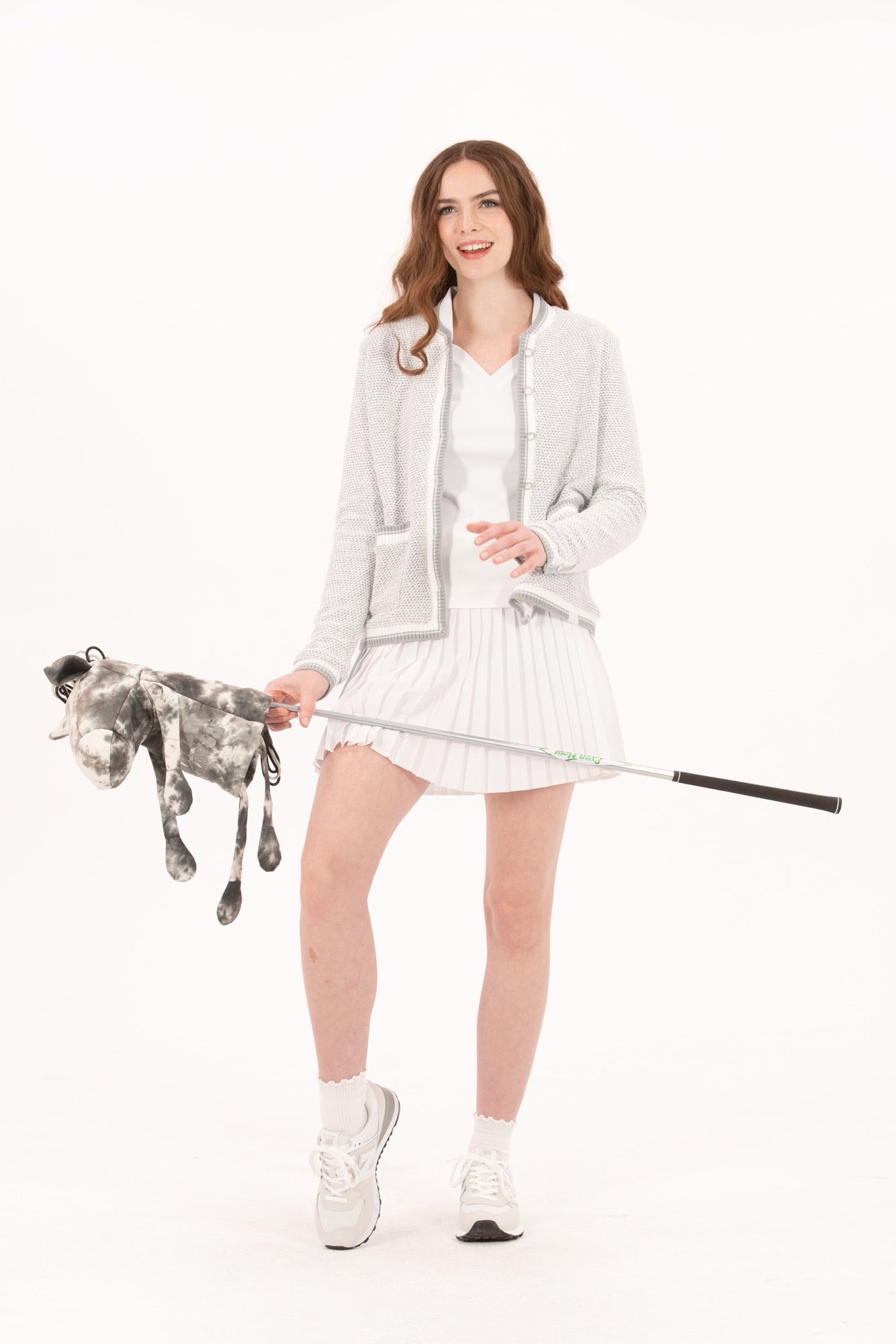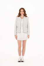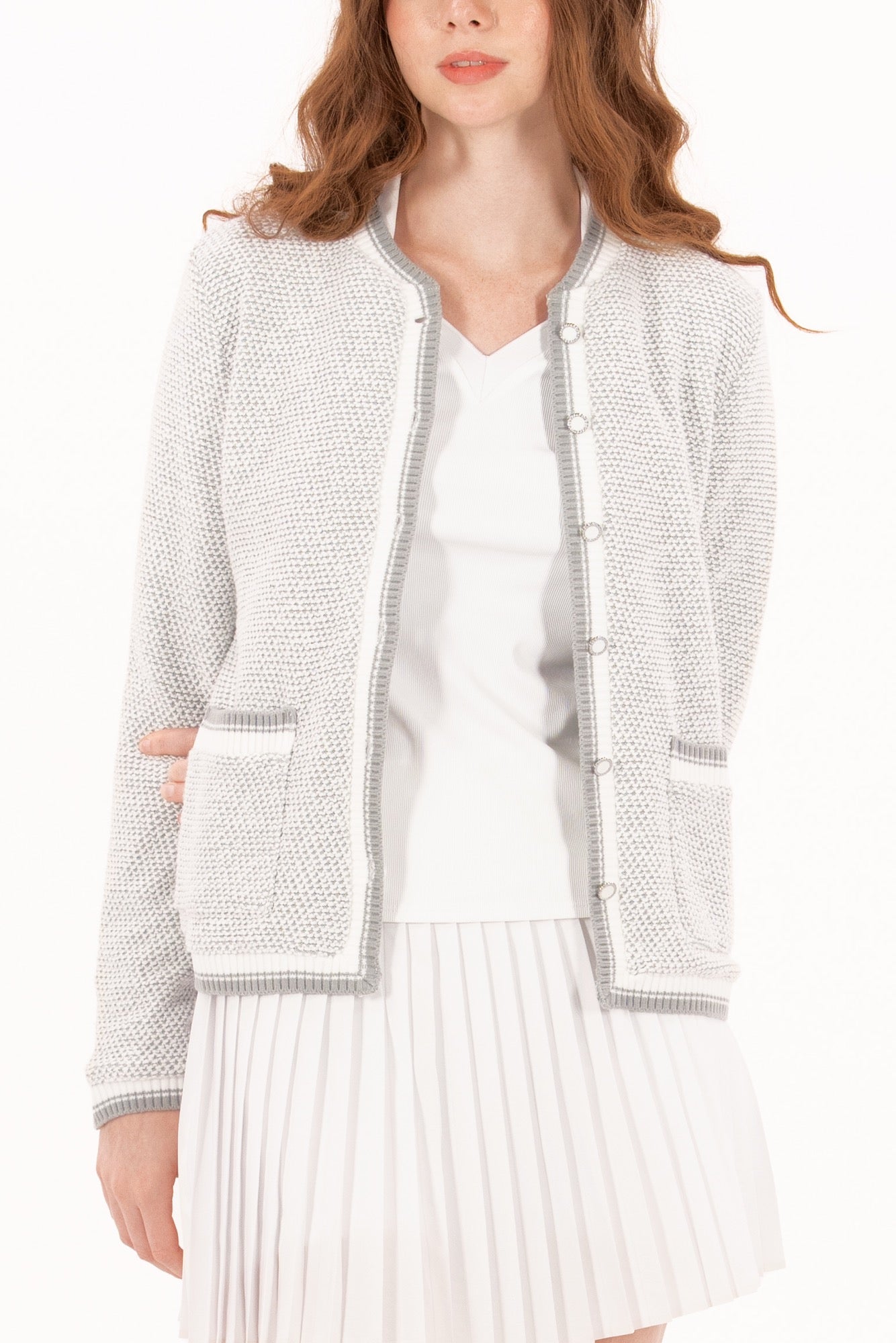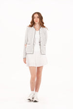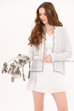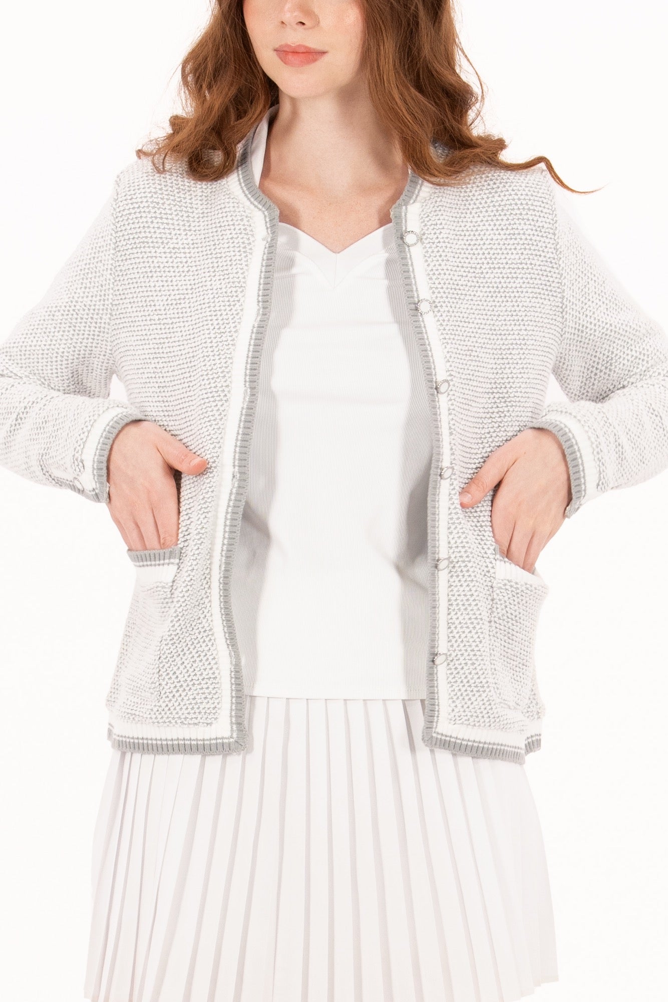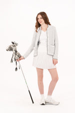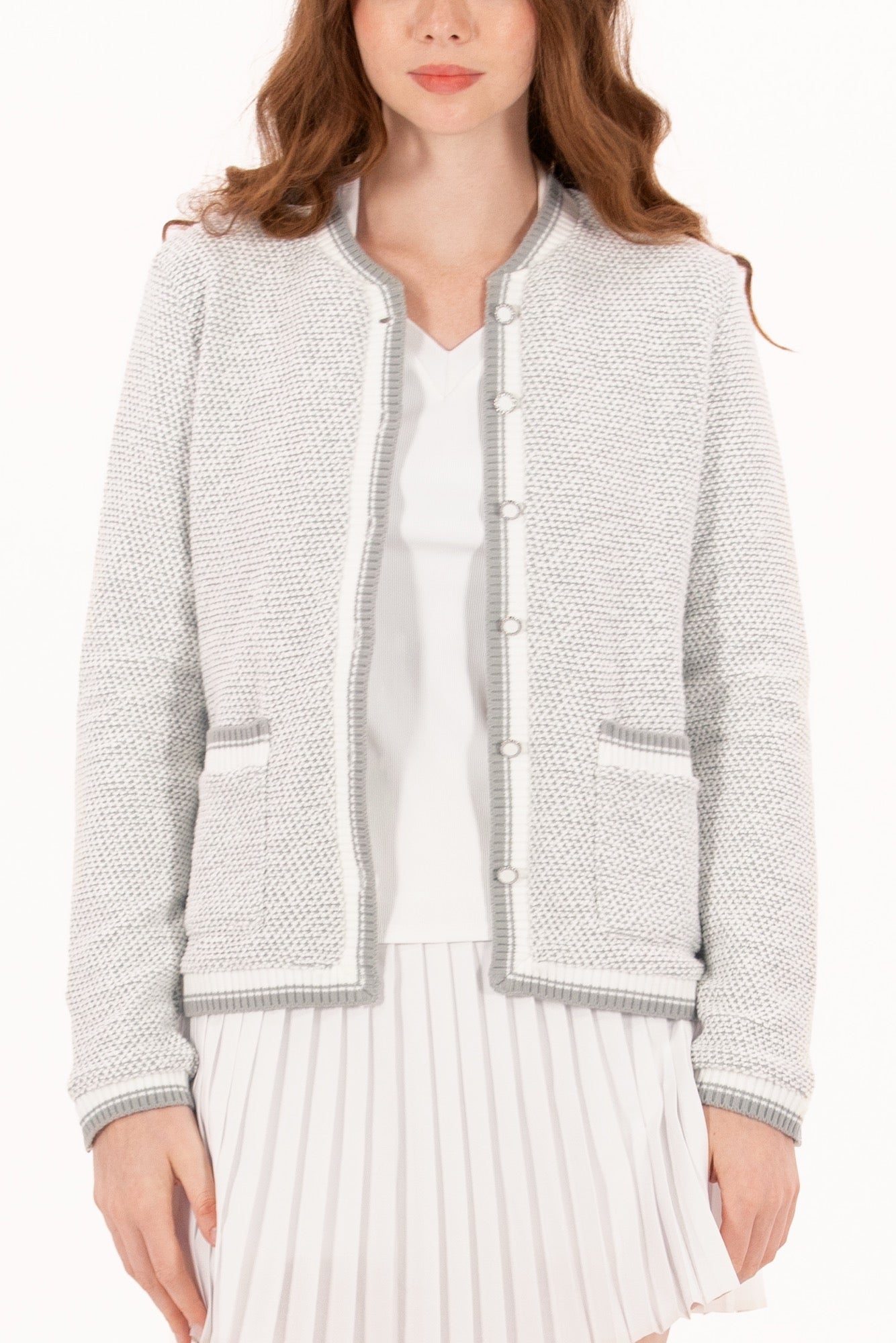 Designed to look like a tailored blazer: polished enough for the boardroom, yet engineered for movement on the course. This chic layer is made from a fully stretch-knit bouclé fabric and finished with tonal pearlized buttons, contrast piping, and trimmed pockets that elevate its classic silhouette. It’s also fully lined for a structured, high-end feel, without compromising on comfort. The neutral white-and-grey colorway makes it endlessly wearable.