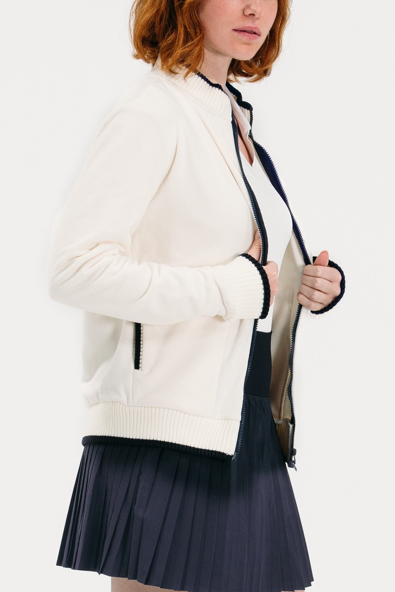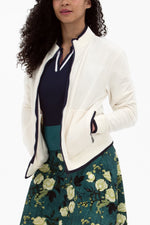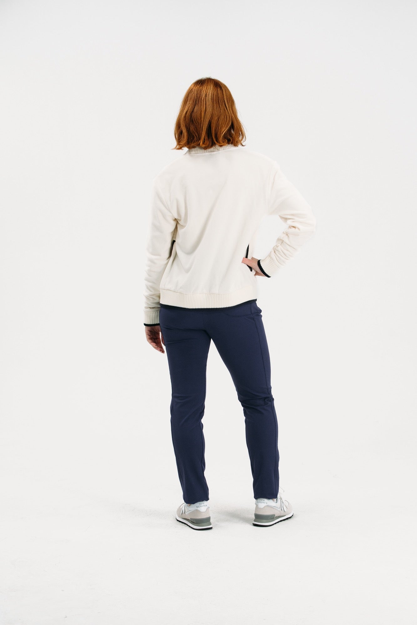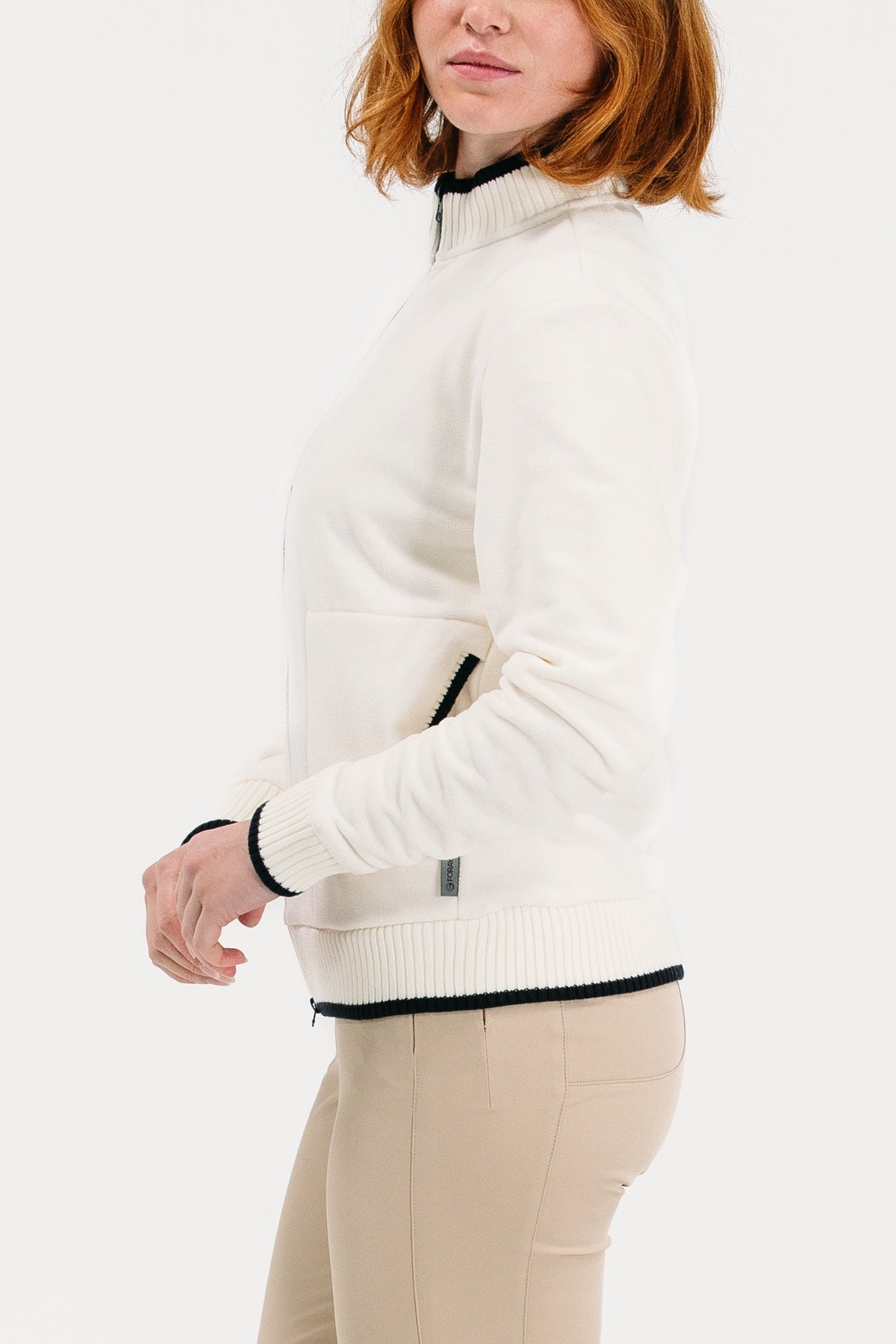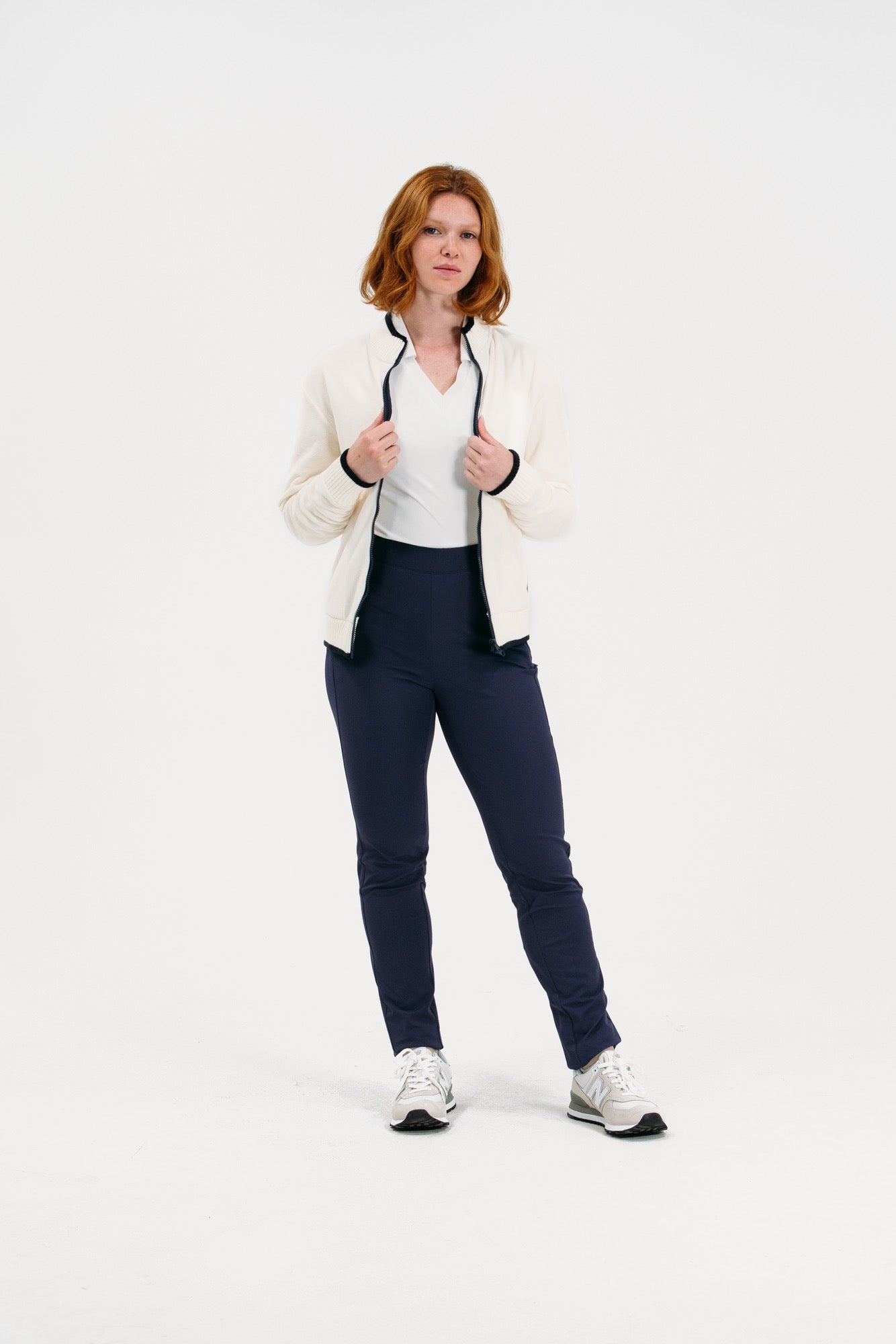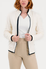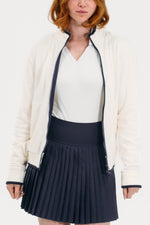 Our fan-favorite bomber is back but in ultra-soft stretch fleece! Equal parts fashion and sport: made from a technical 4-way stretch, mid-weight stretch fleece and trimmed with coordinating navy and white rib at neck, cuff and hem. Dual front zippered pockets and shaped seams that contour fit, making her the most flattering layer in your wardrobe.