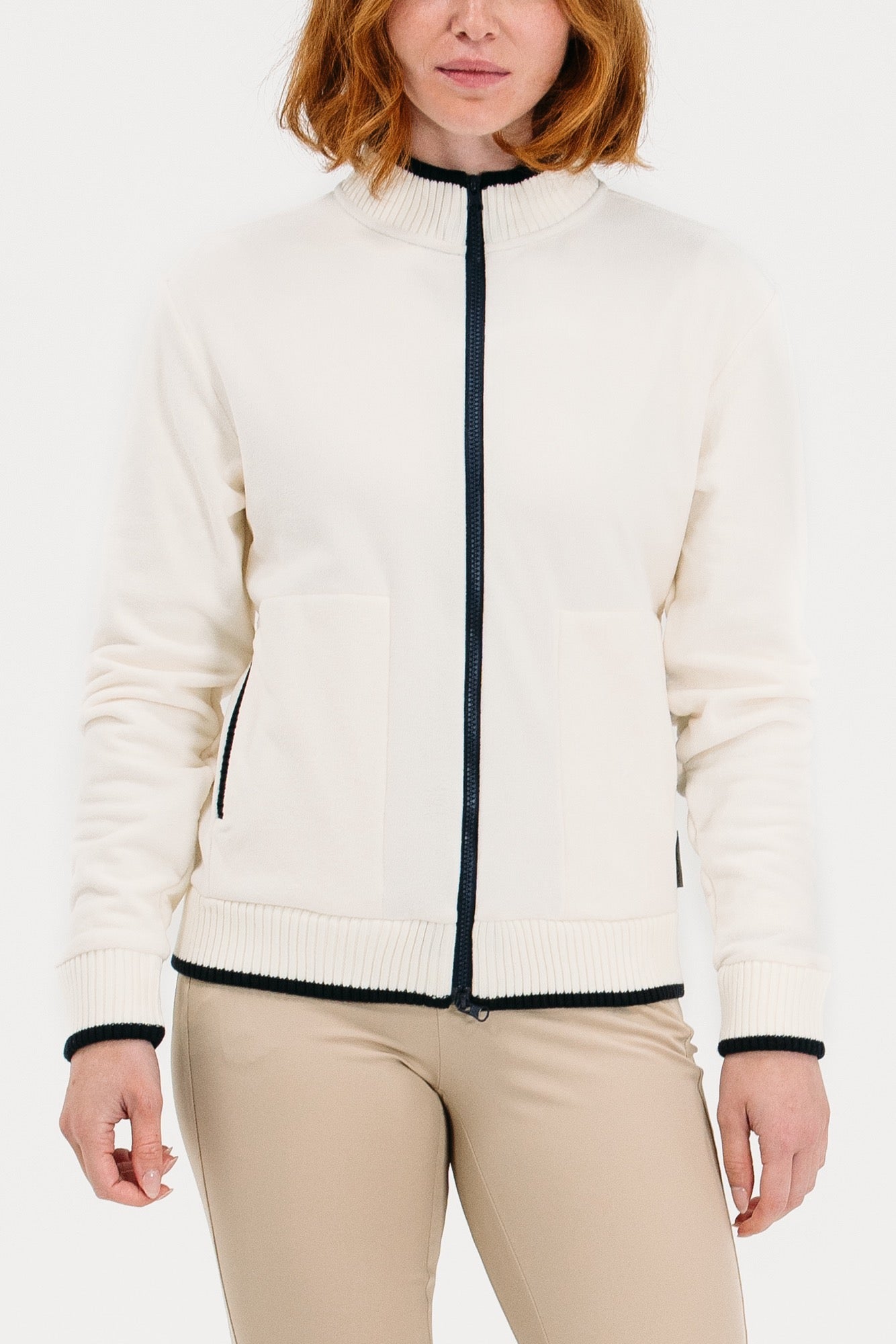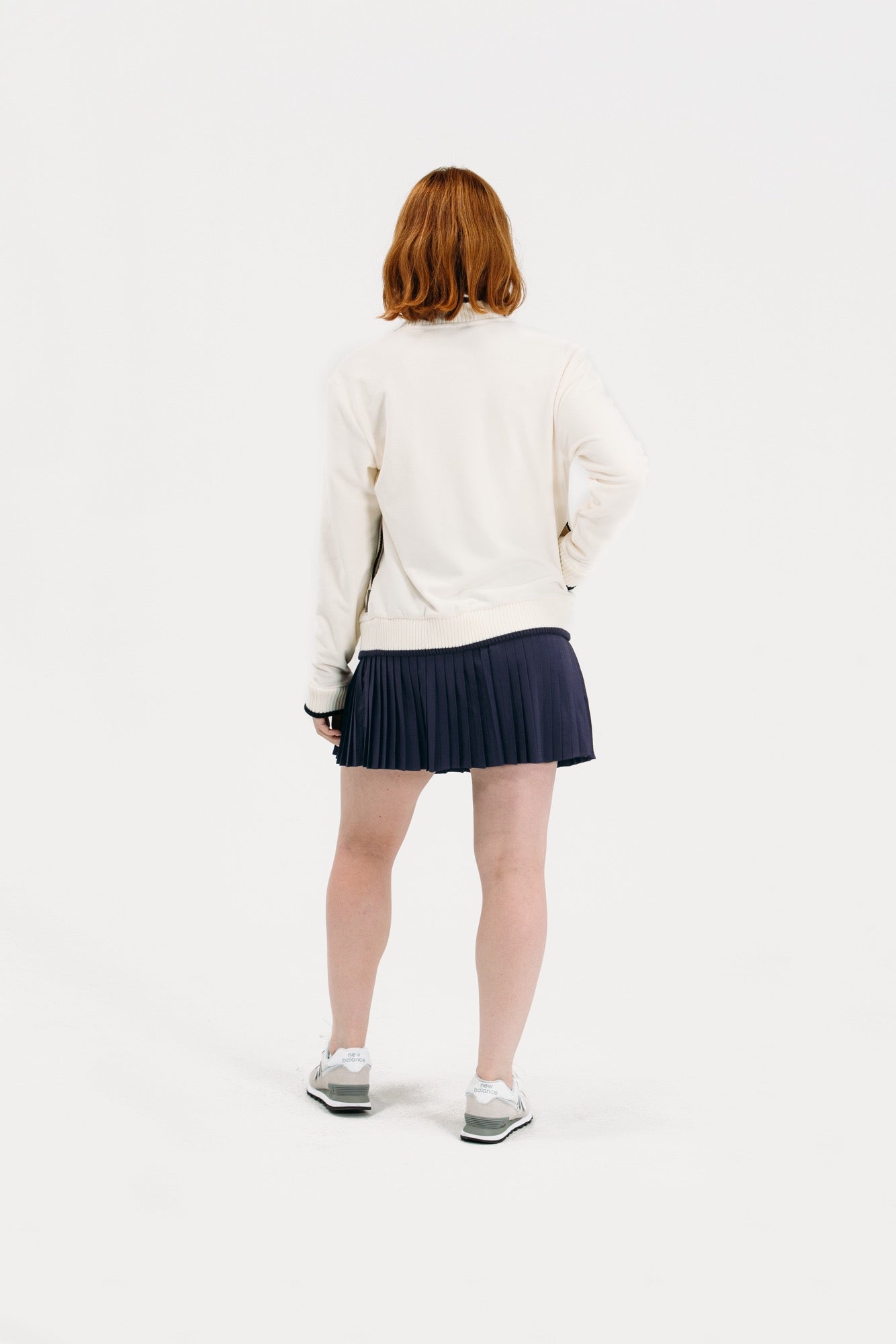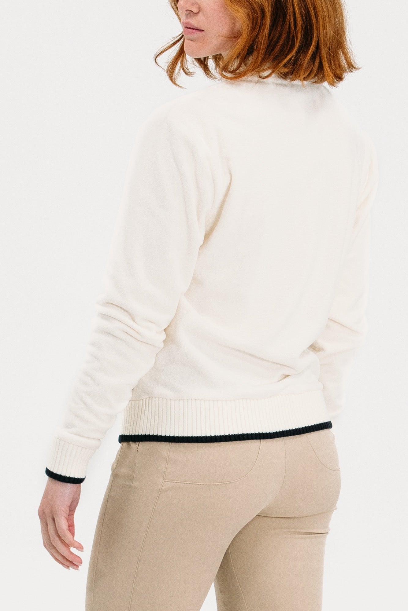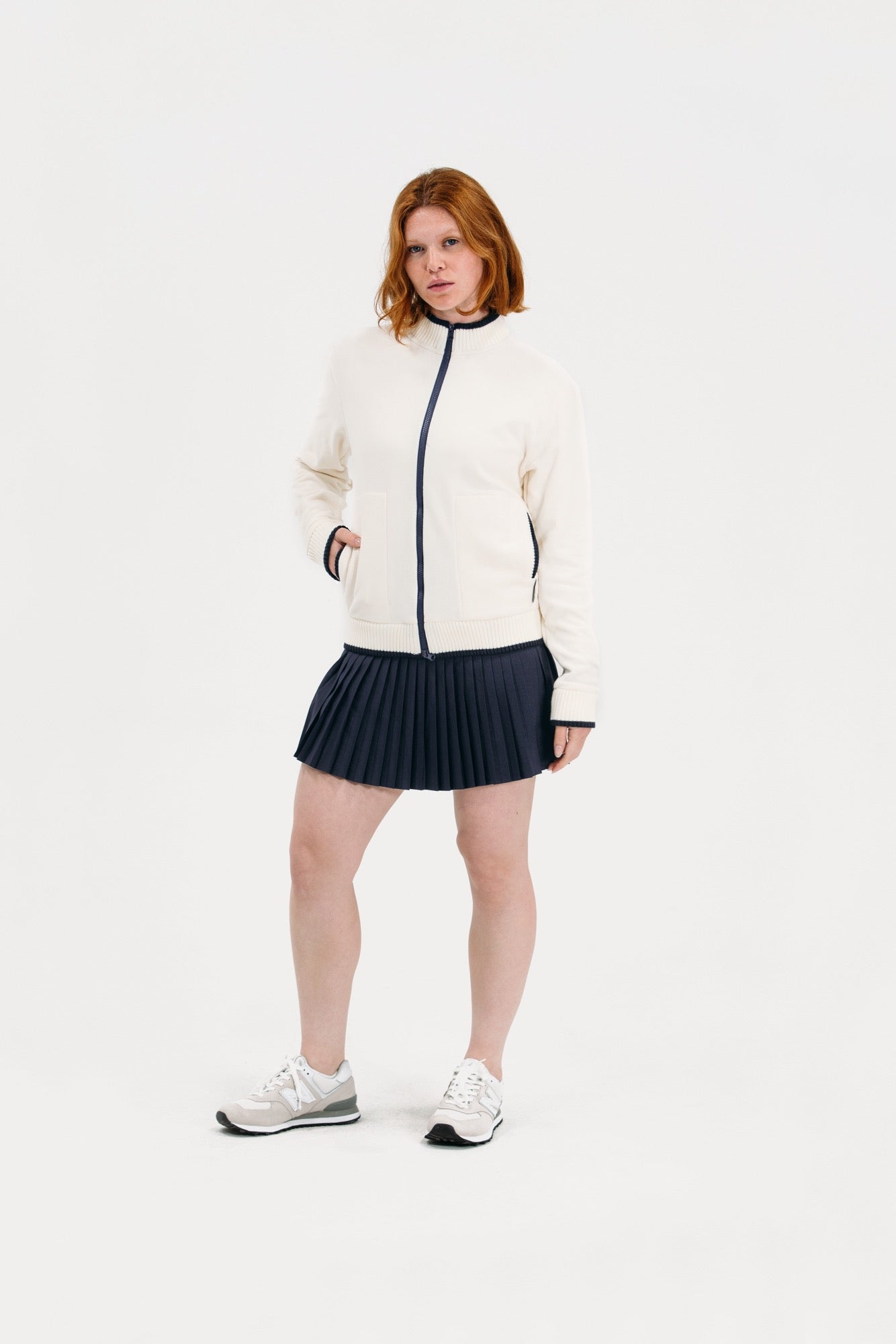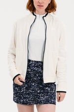 Our fan-favorite bomber is back but in ultra-soft stretch fleece! Equal parts fashion and sport: made from a technical 4-way stretch, mid-weight stretch fleece and trimmed with coordinating navy and white rib at neck, cuff and hem. Dual front zippered pockets and shaped seams that contour fit, making her the most flattering layer in your wardrobe.