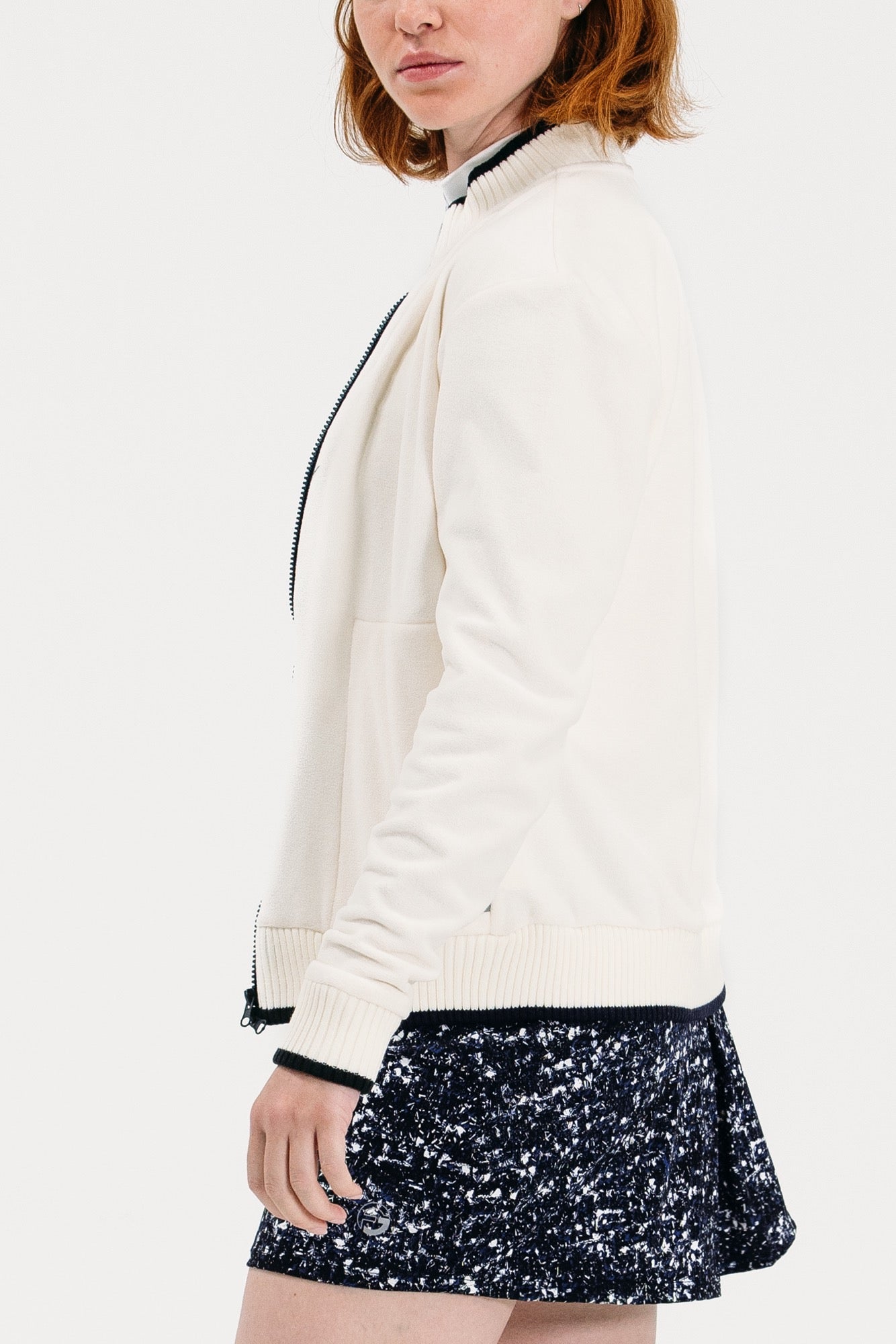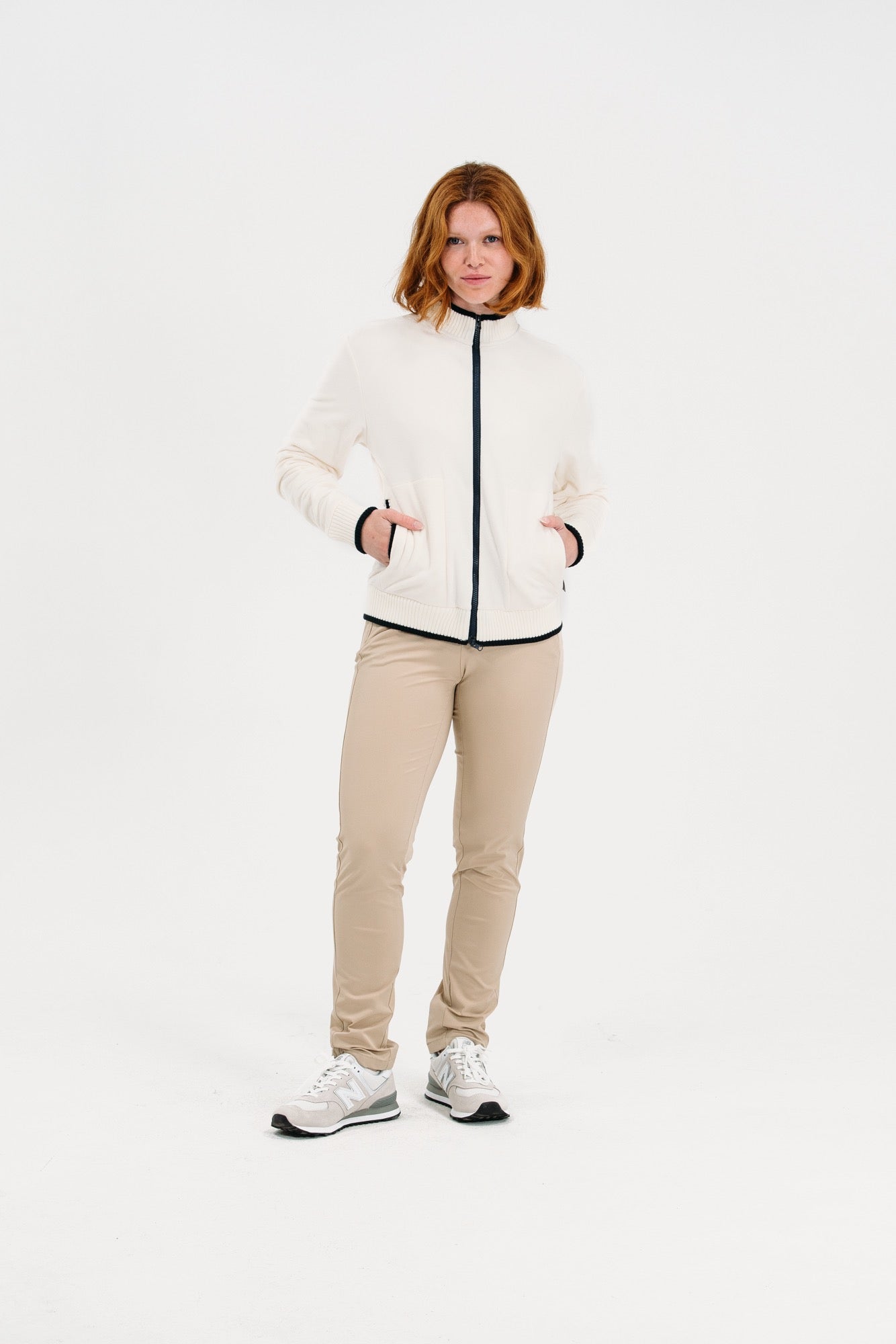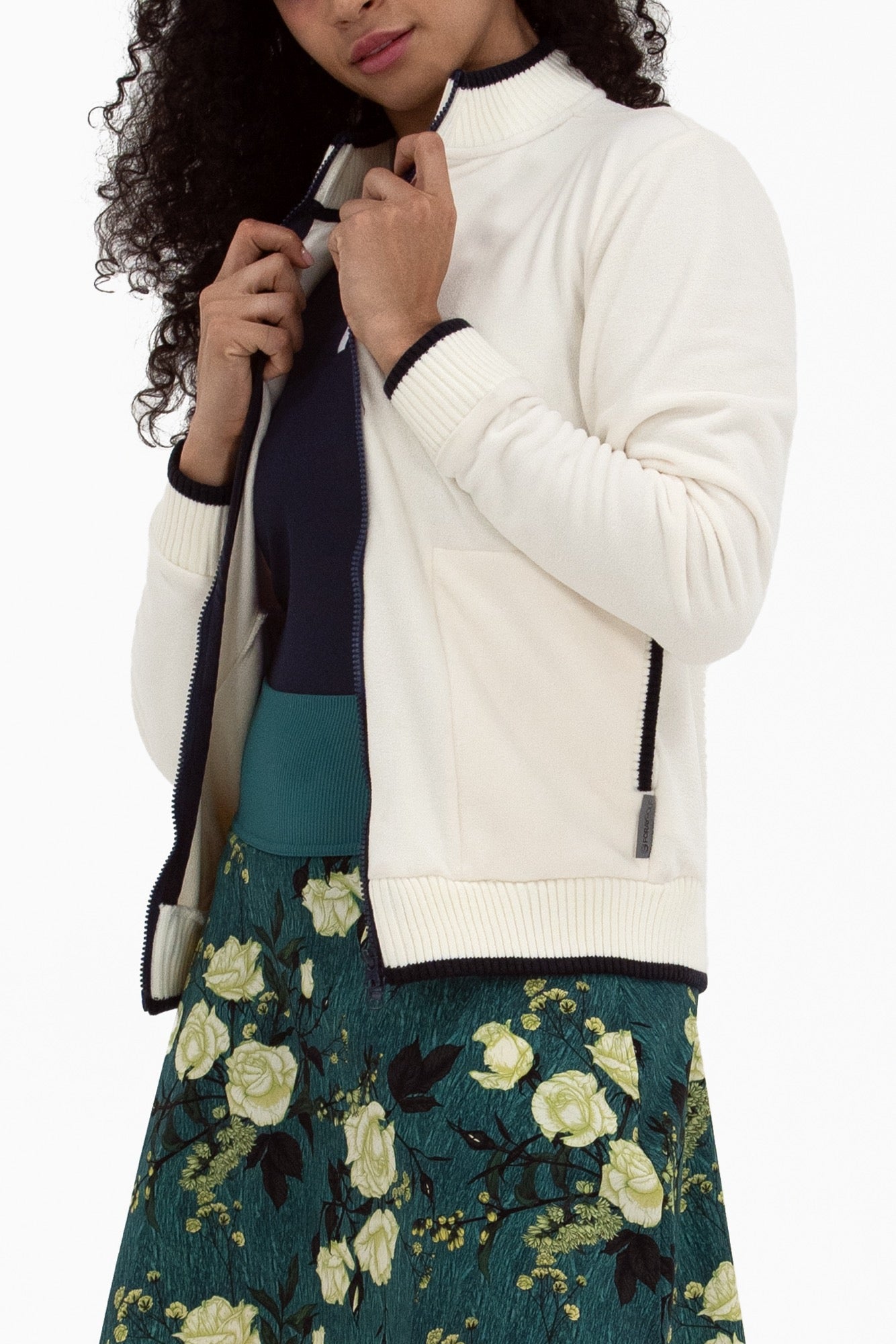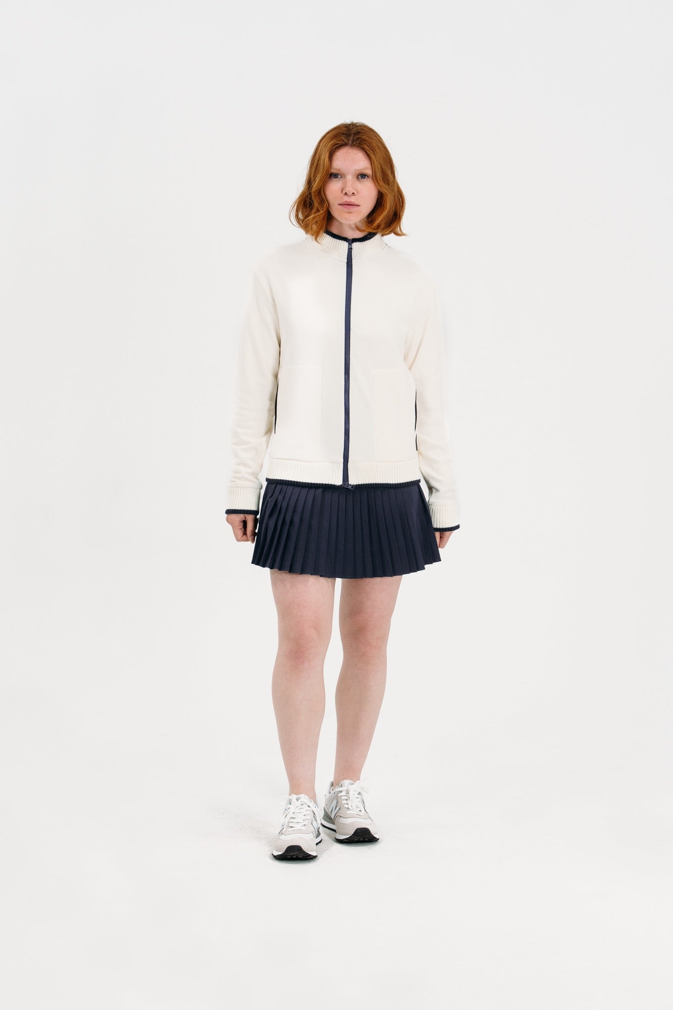 Our fan-favorite bomber is back but in ultra-soft stretch fleece! Equal parts fashion and sport: made from a technical 4-way stretch, mid-weight stretch fleece and trimmed with coordinating navy and white rib at neck, cuff and hem. Dual front zippered pockets and shaped seams that contour fit, making her the most flattering layer in your wardrobe.
