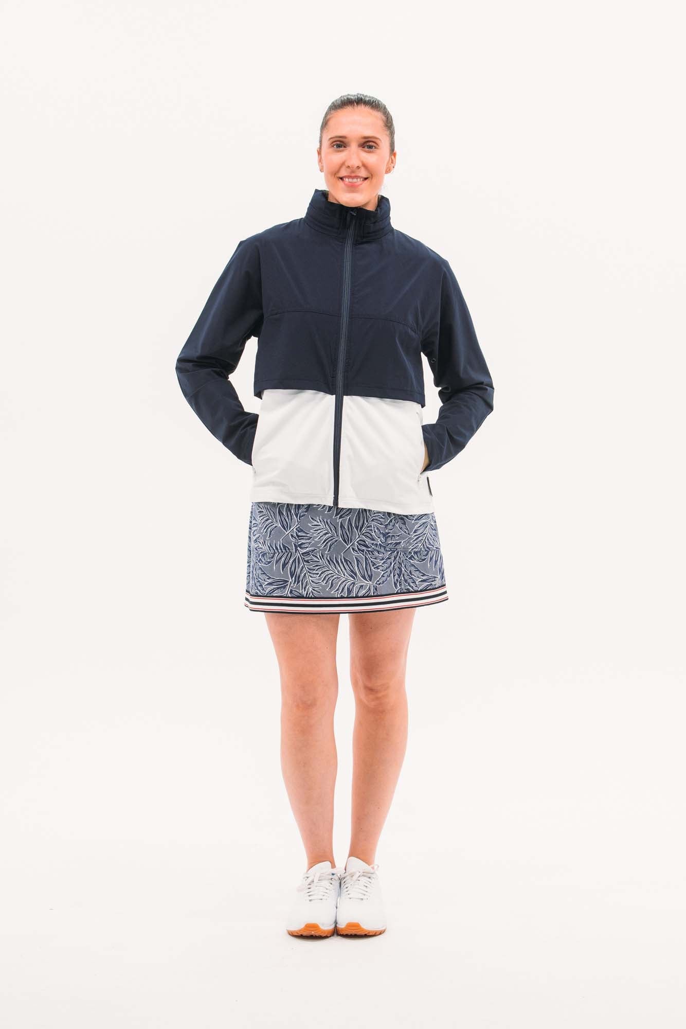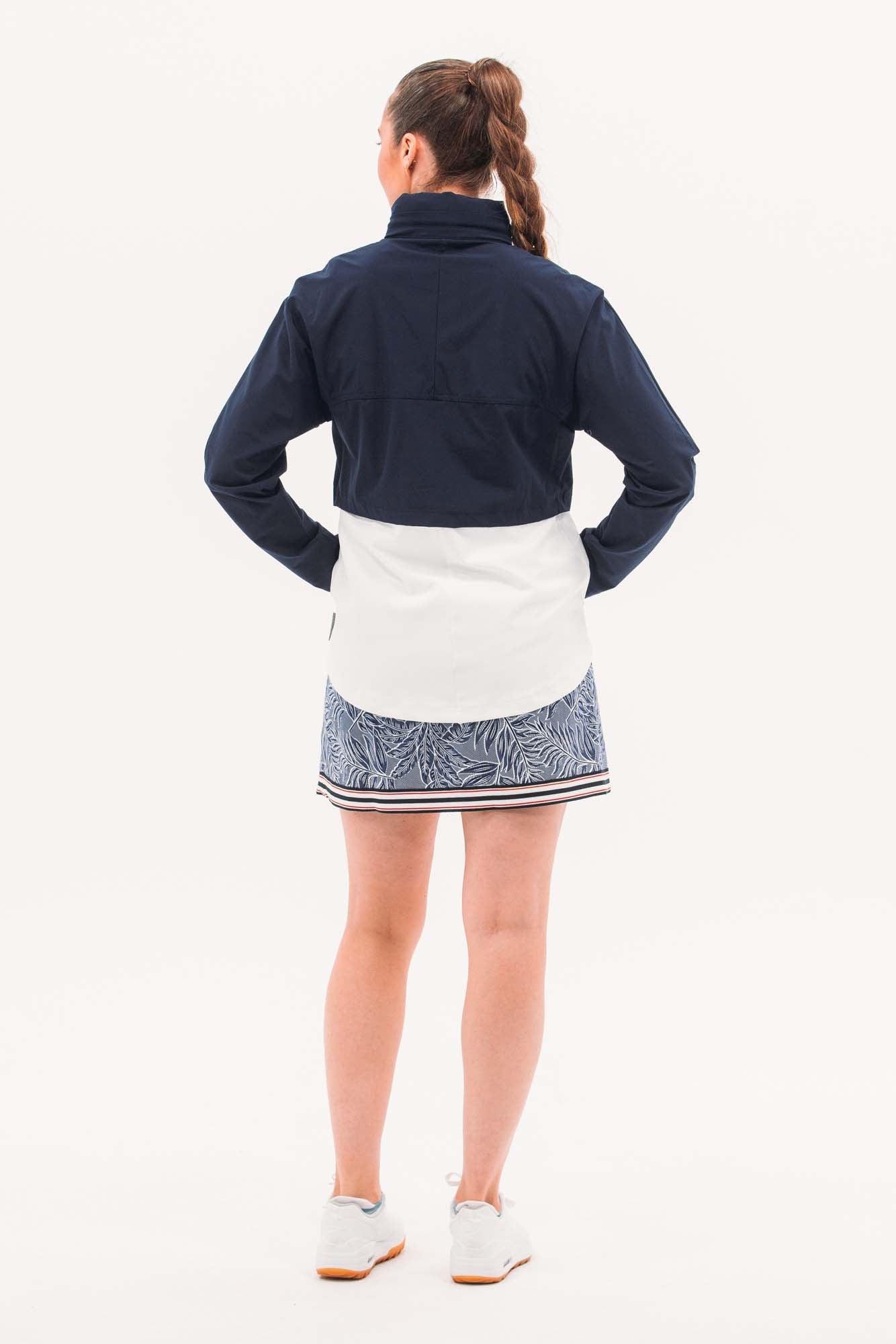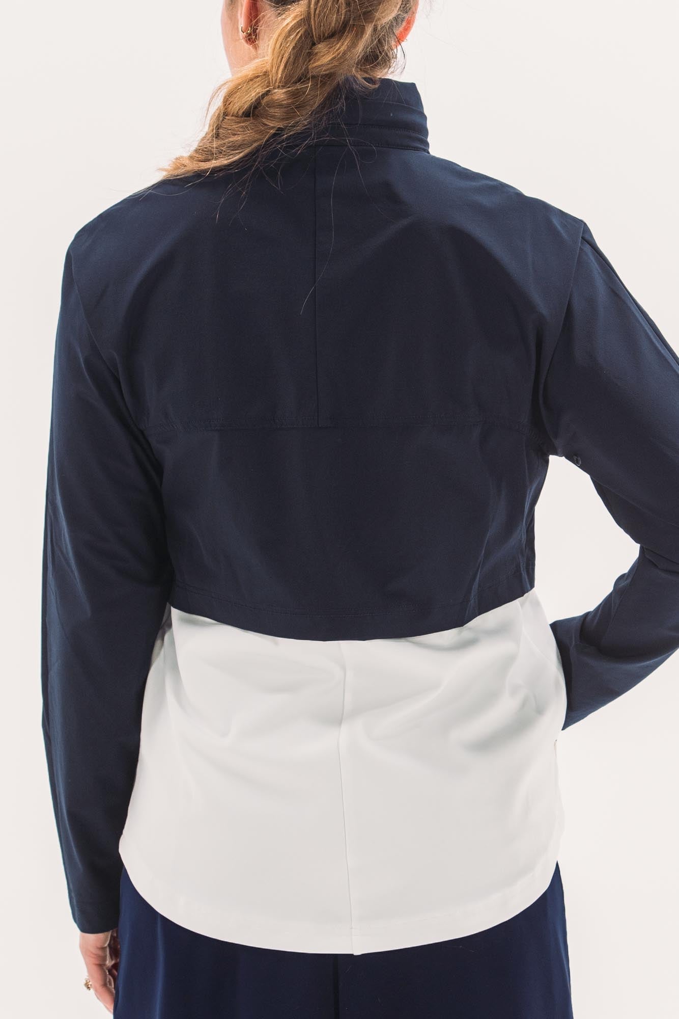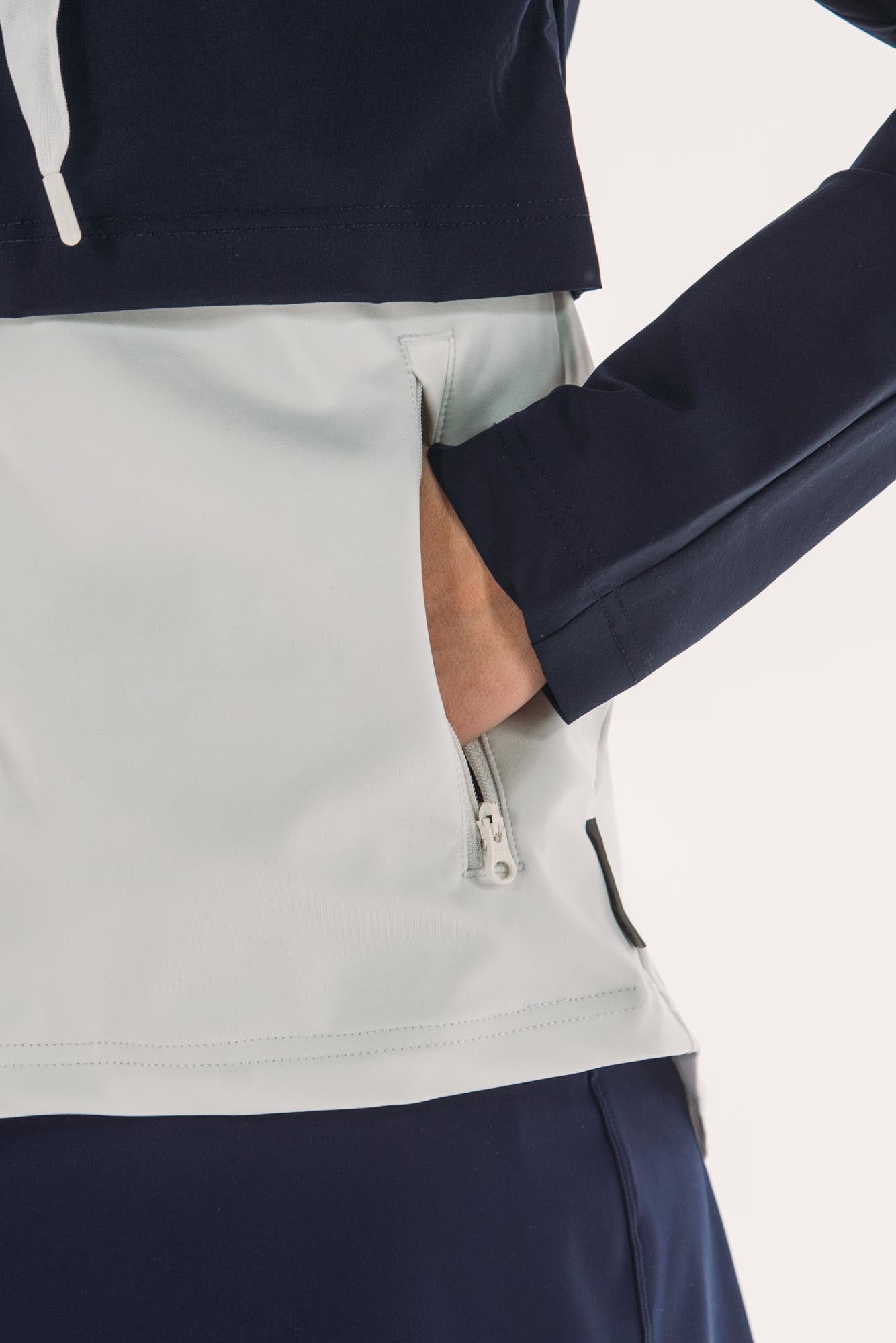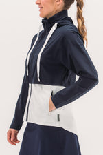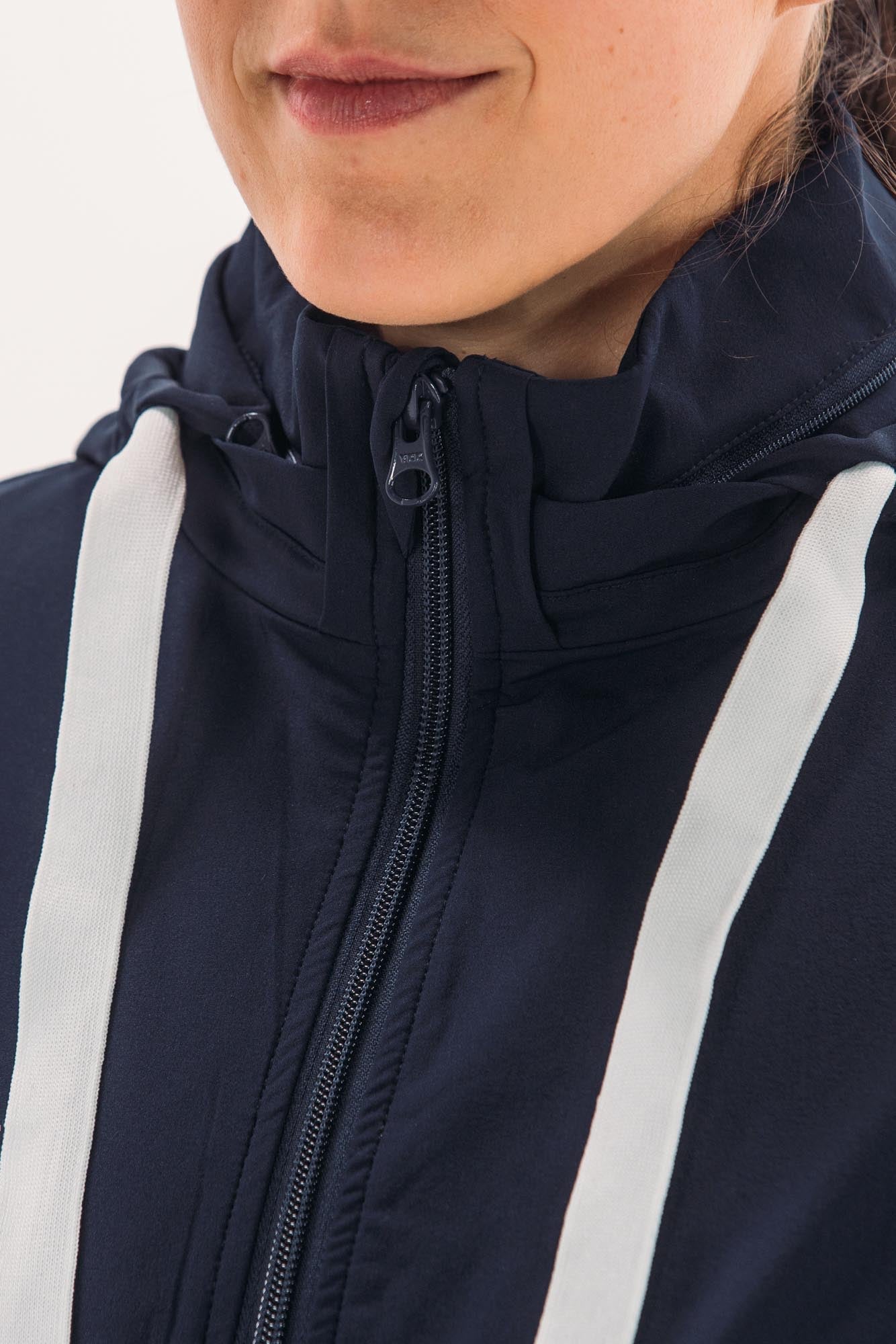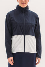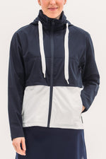 Two-part jacket that is best of both worlds! Weather resistant upper layer blocks wind and rain, while the stretchy under layer skims the body to provide shape. Bottom hem hits below waistband, giving additional coverage and packable hood means you'll be ready for anything that comes your way.