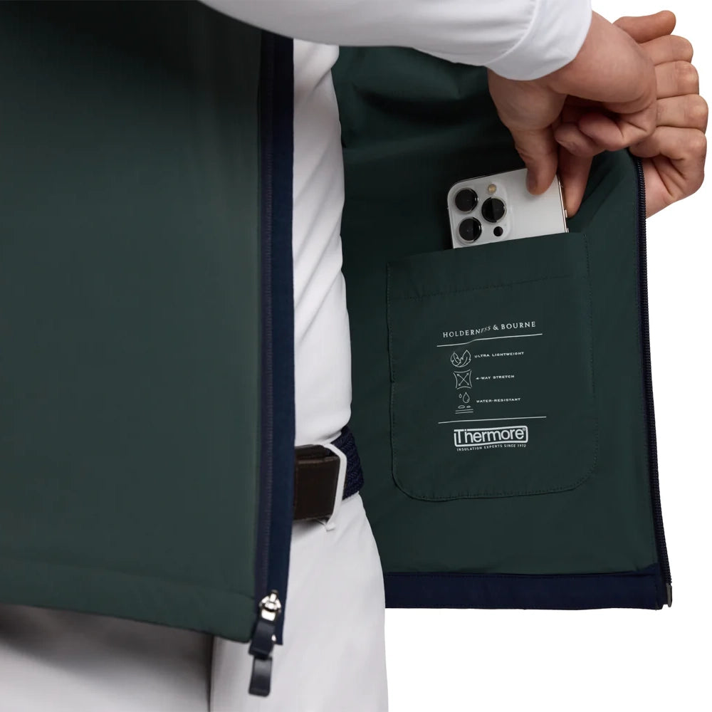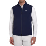 The Swenson is an insulated hybrid vest that combines lightweight synthetic insulation with softshell performance fabric for lightweight warmth and mobility. Finished with premium zippers, an interior chest pocket, and a tonal back yoke embroidery detail. Ideal for cooler weather on the course or casual wear.