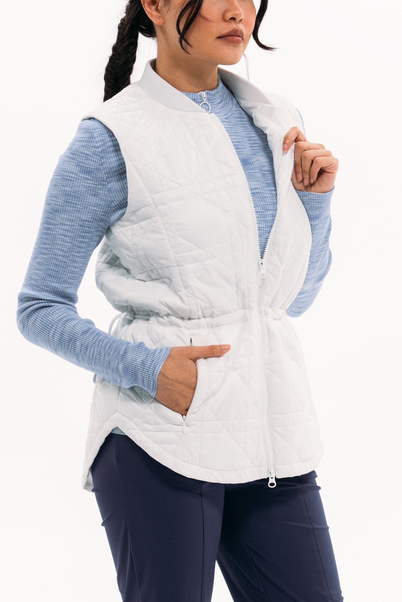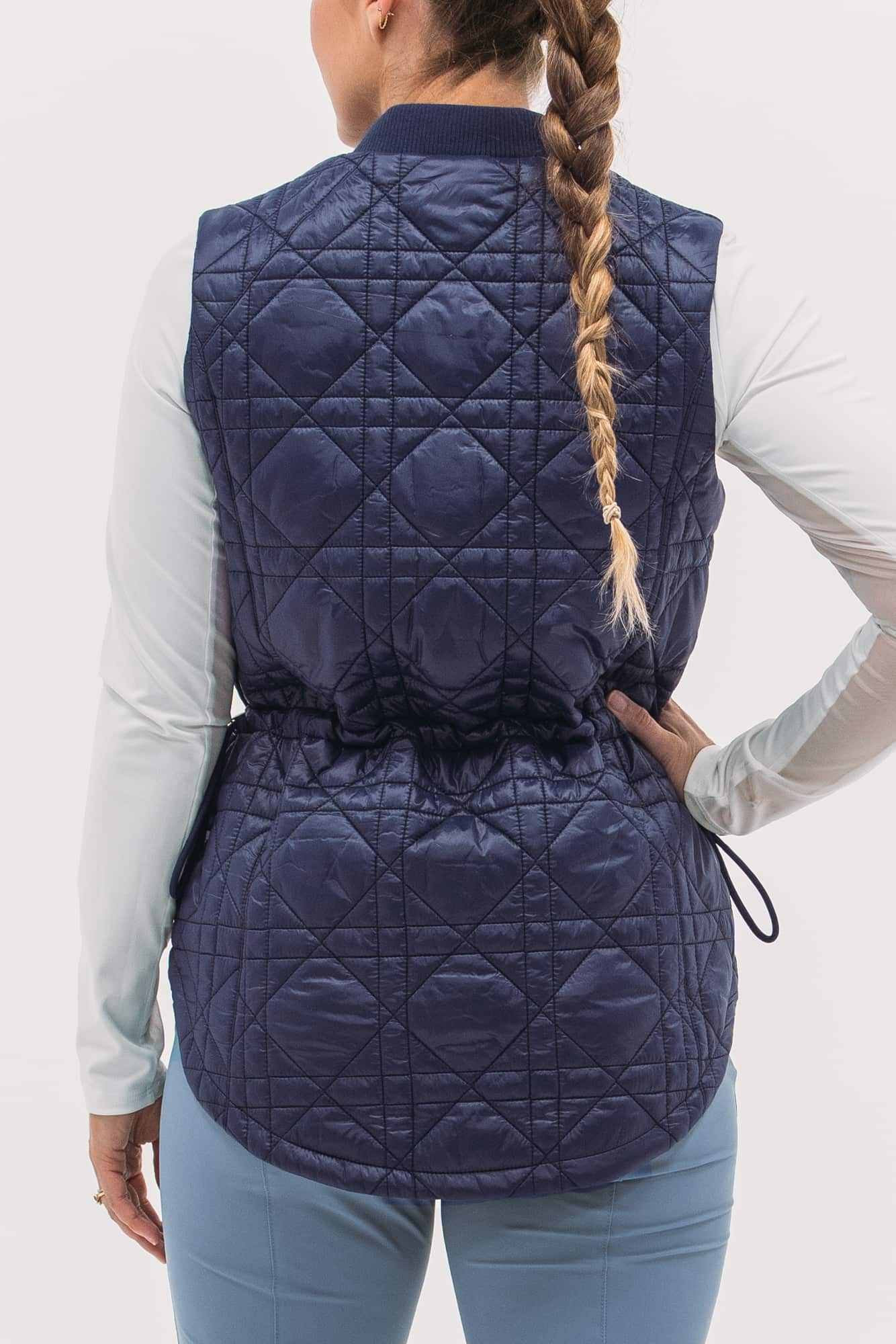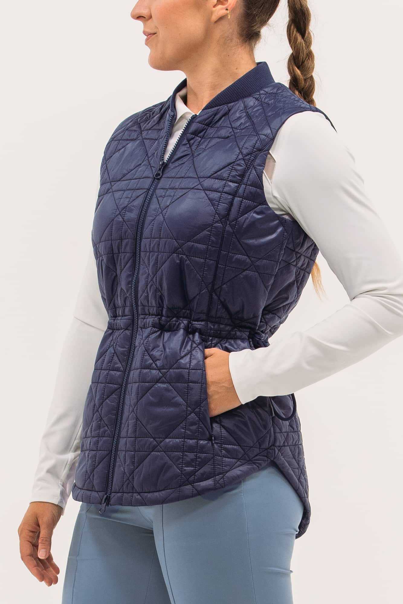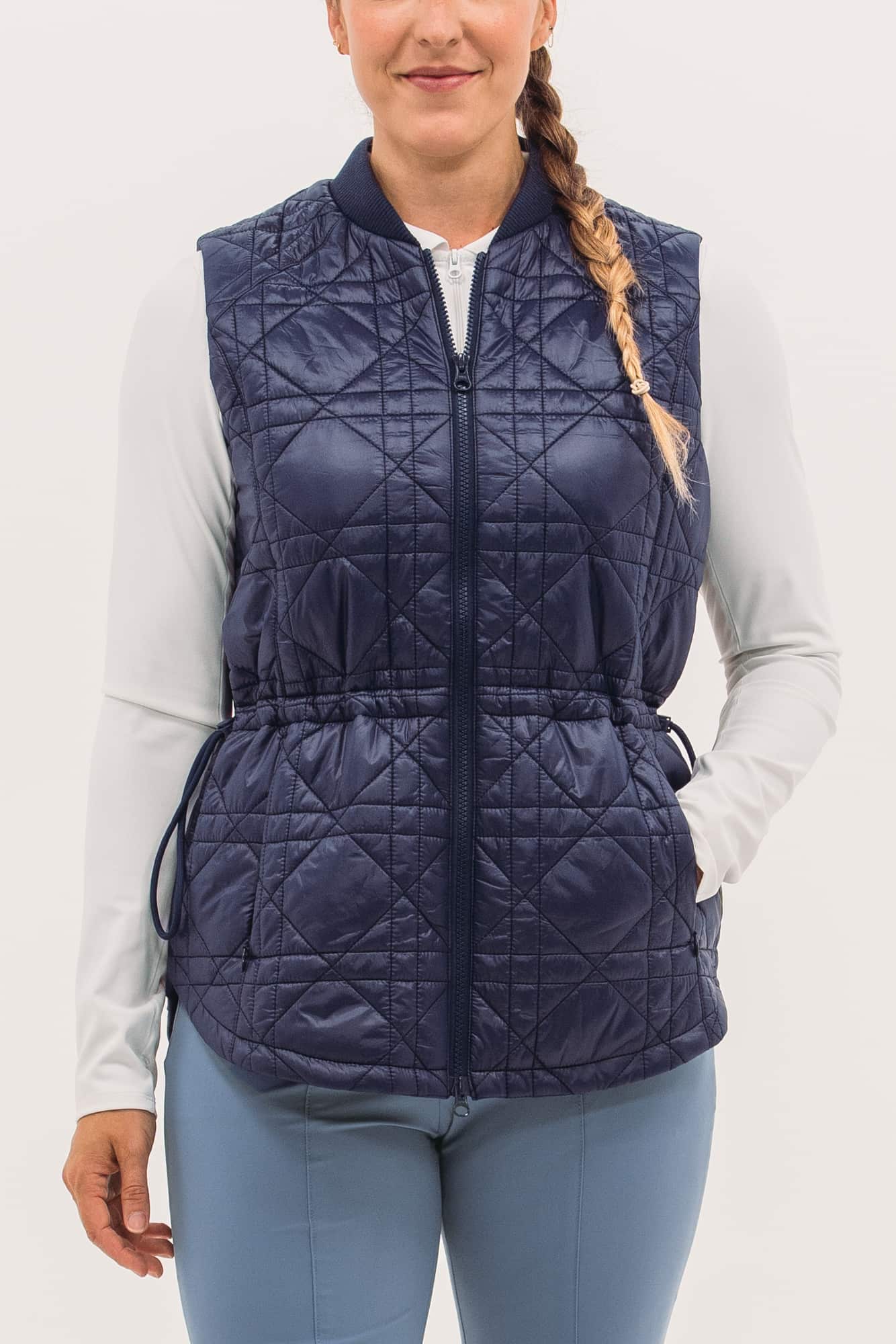 Our packable quilted vests are ideal for layering: lightweight and not bulky. Featuring a nylon water-repellent shell filled with insulating synthetics that won't harm any geese. Even better, they pack in a neat little pouch, perfect for travel or mid-round temperature drops. This long-line version features a new quilted-cane pattern, two-way zip, pockets and waistband toggle for fit.