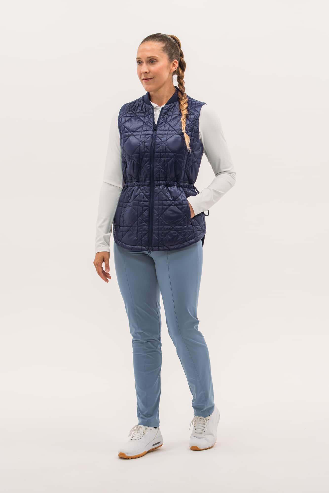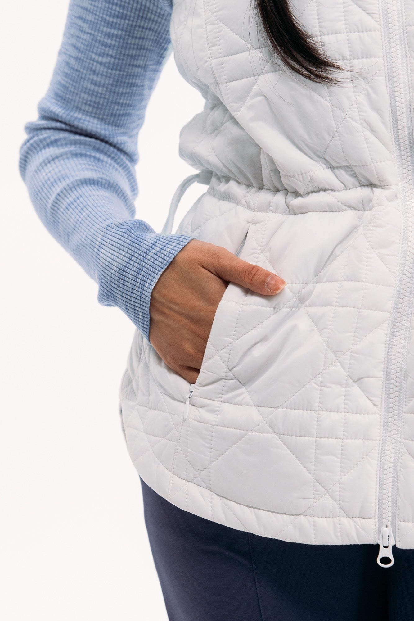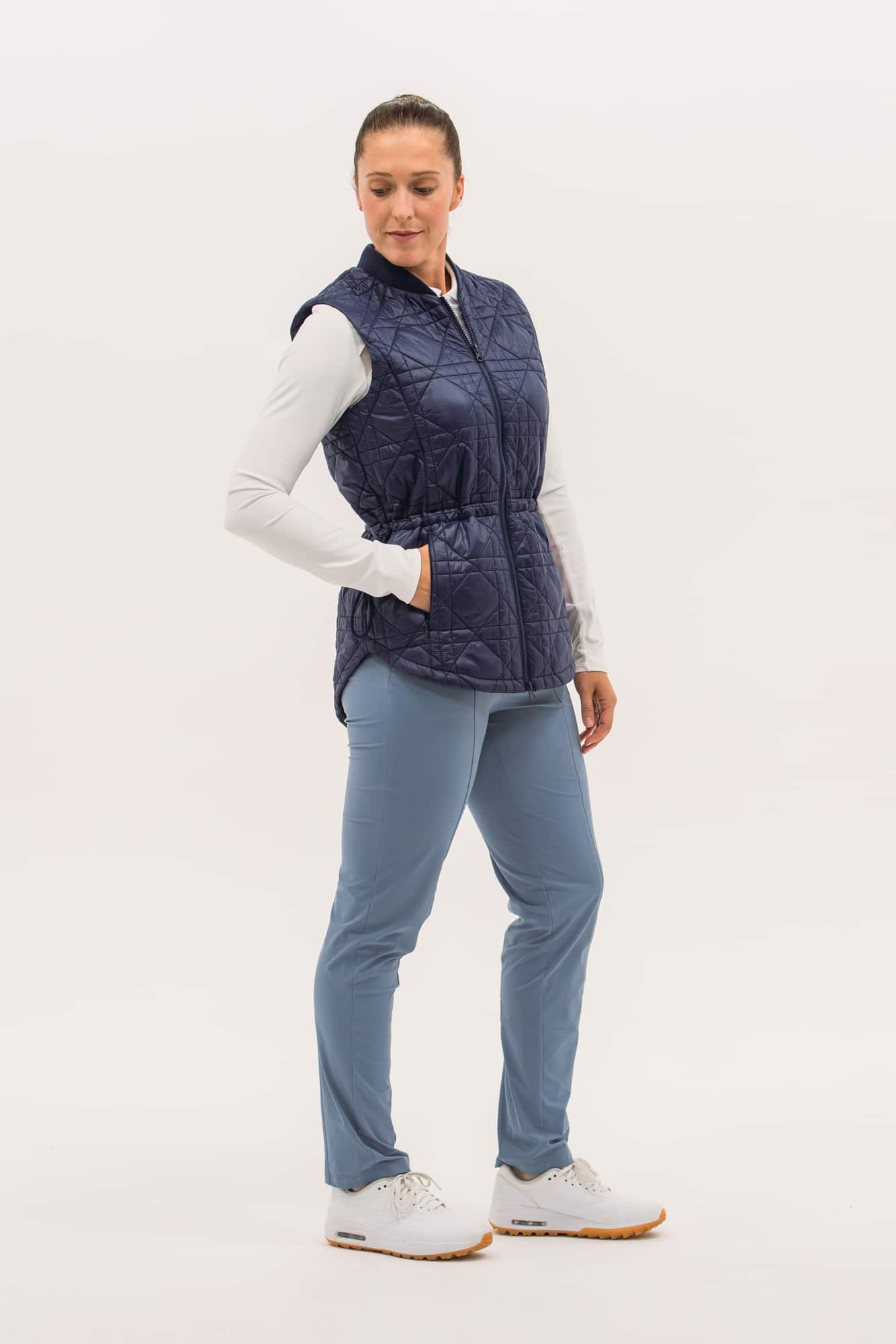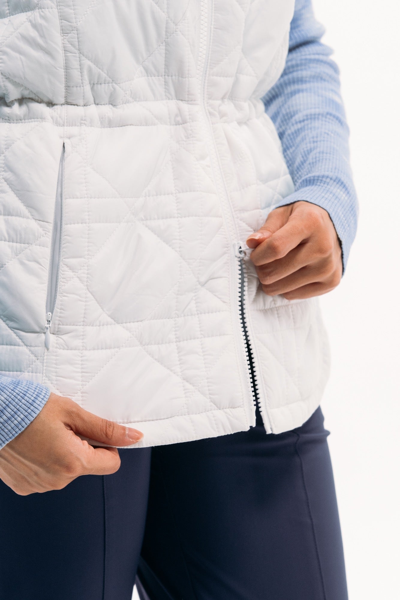 Our packable quilted vests are ideal for layering: lightweight and not bulky. Featuring a nylon water-repellent shell filled with insulating synthetics that won't harm any geese. Even better, they pack in a neat little pouch, perfect for travel or mid-round temperature drops. This long-line version features a new quilted-cane pattern, two-way zip, pockets and waistband toggle for fit.