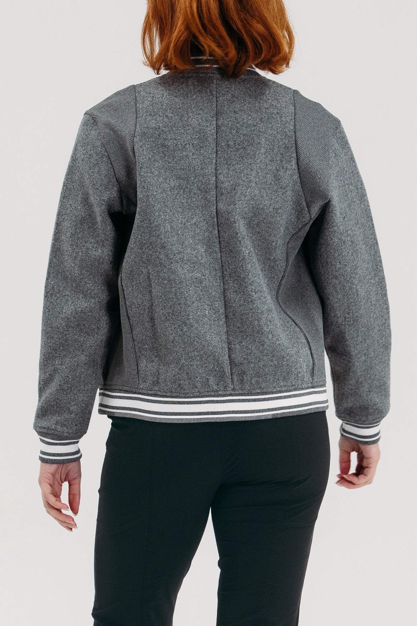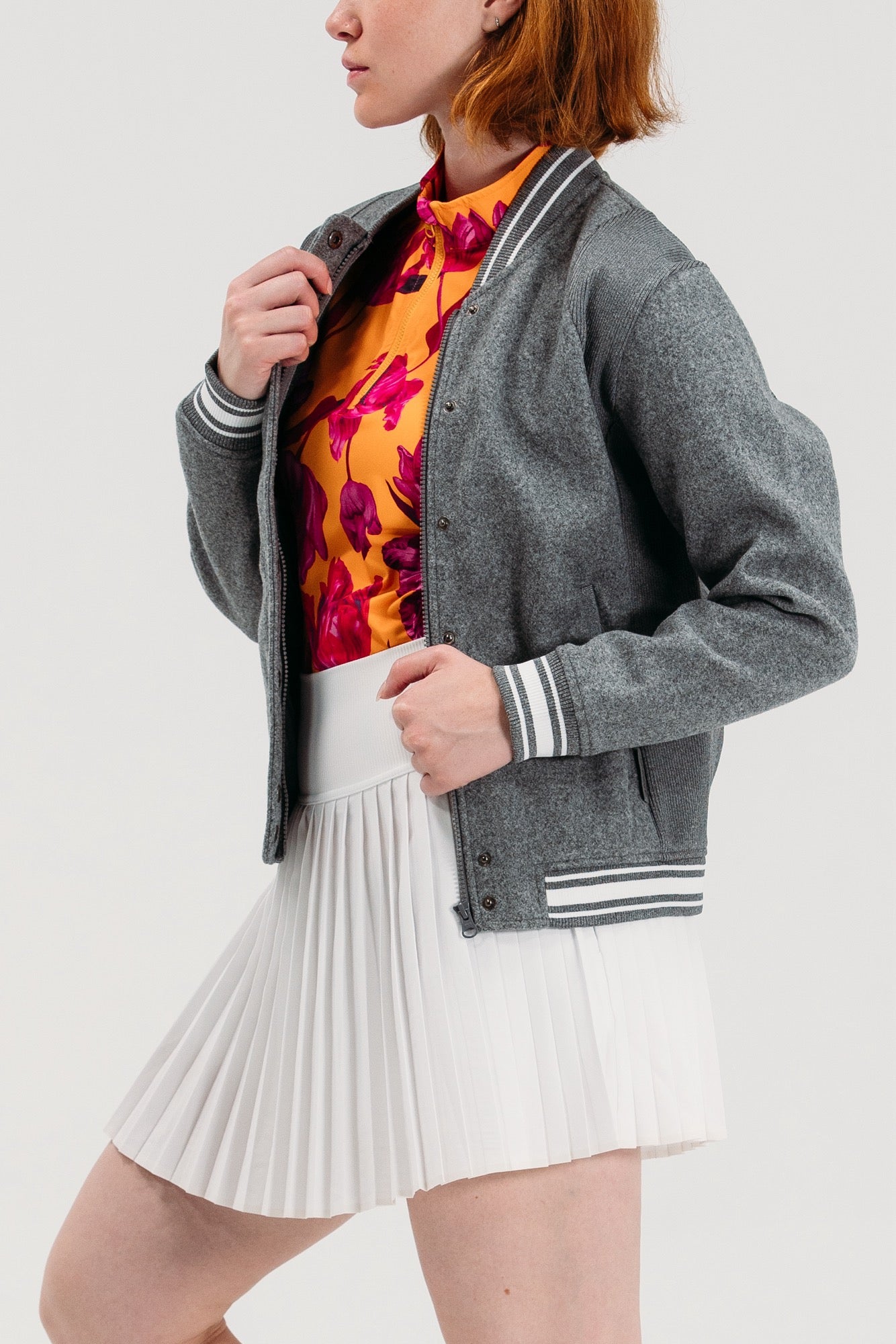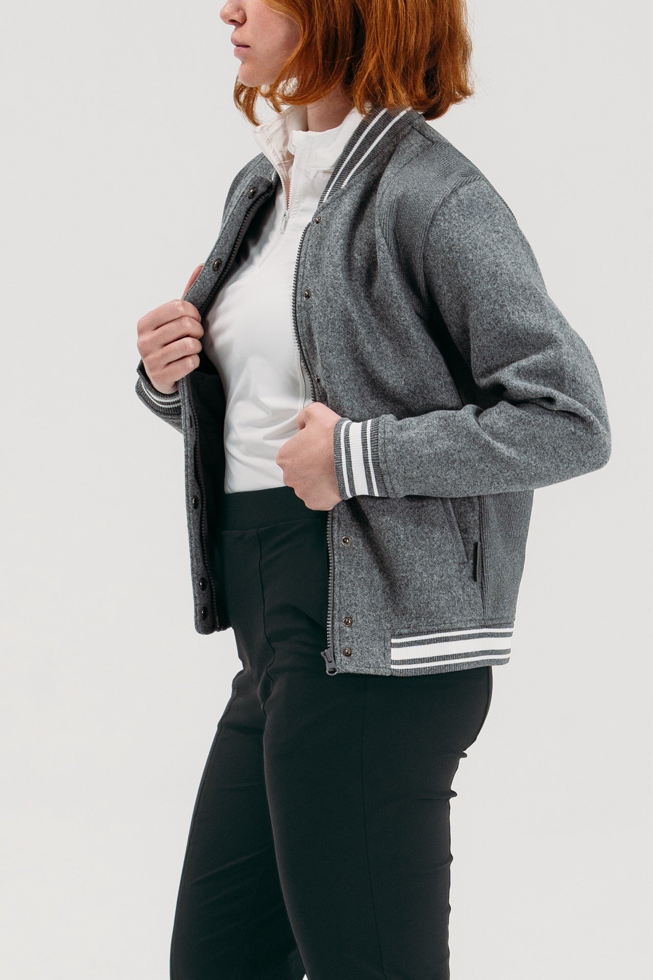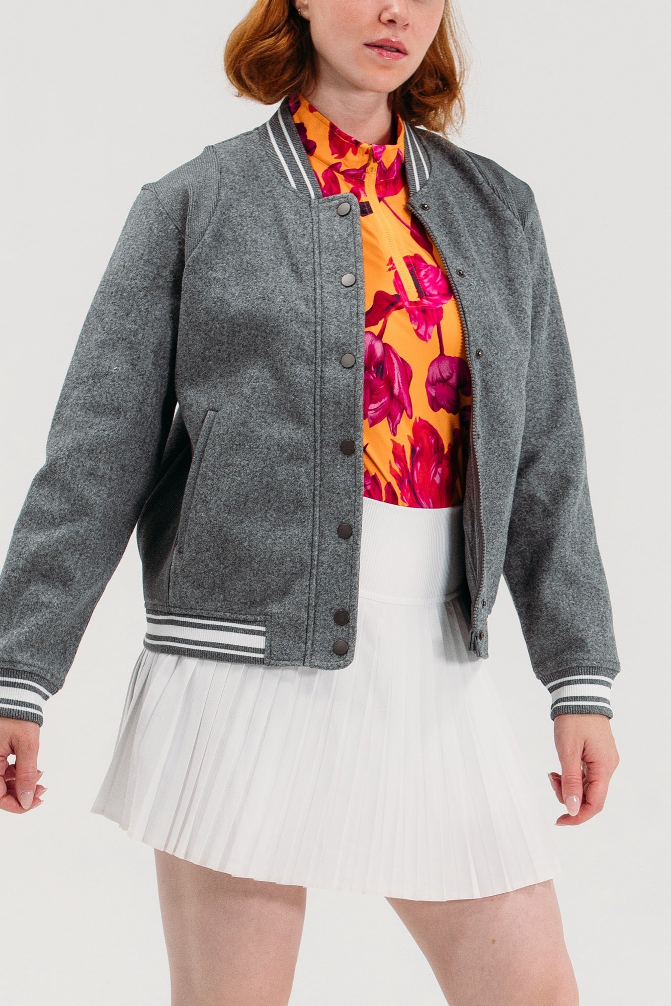 Ivy-league campus inspired, check out our famous bomber made just right for Fall. Crafted out of technical felted knit and trimmed with coordinating rib trim  across shoulders and sides for added stretch and mobility. Versatile and totally of the moment - wear her with literally anything to exude prep-school-cool