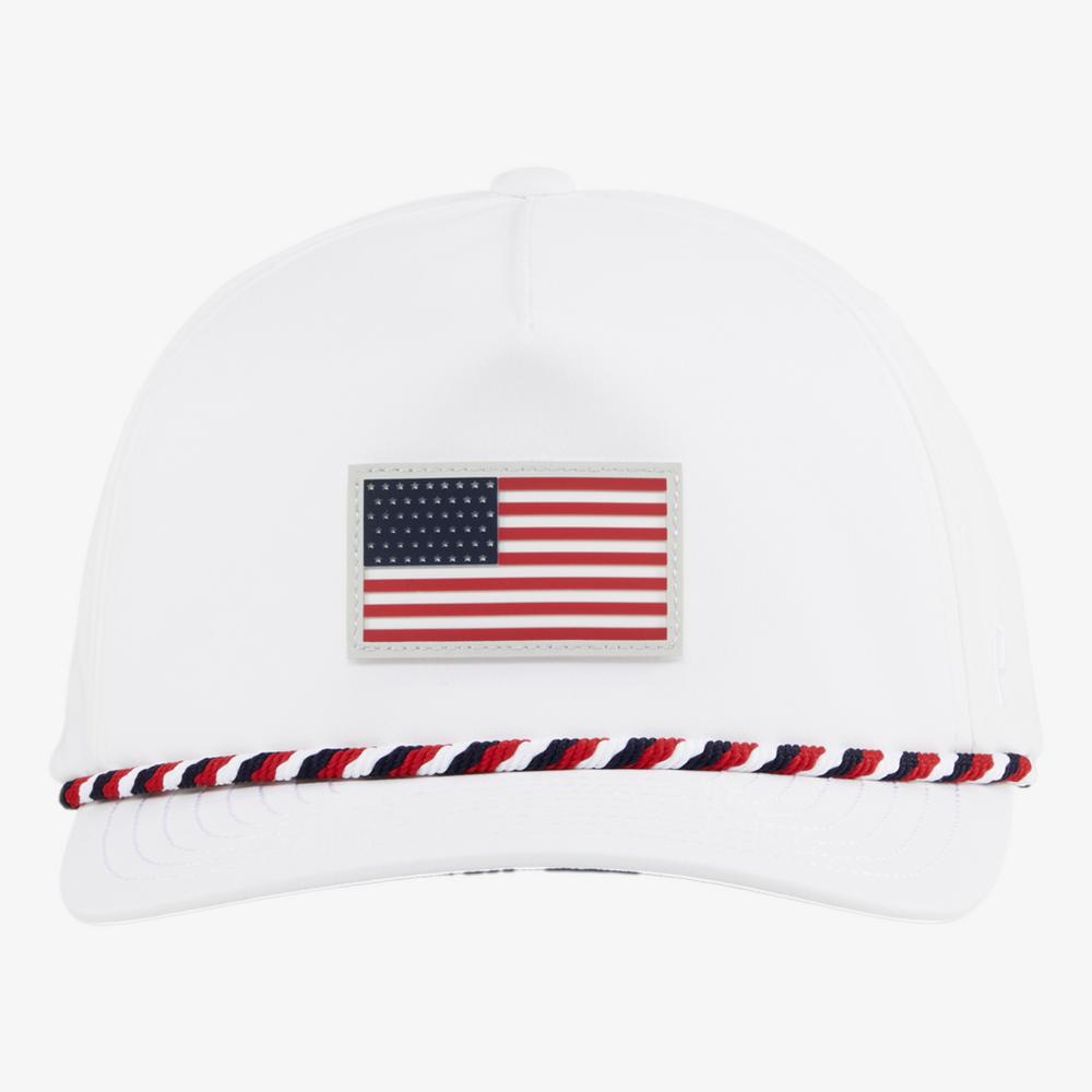 The Puma Volition Tactical Patch Snapback Golf Hat features a front loop patch with an embossed cat logo that has a removable American Flag patch. This hat is part of Puma's Volition collection that supports the Folds of Honor Foundation.