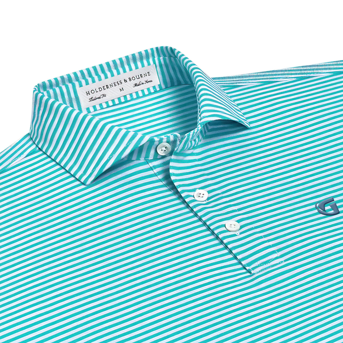 The Maxwell Shirt is a modern take on the classic bengal stripe, crafted from lightweight yarn-dyed performance fibers. The DryLuxe performance pique fabric, composed of 94% polyester and 6% elastane, ensures breathability and comfort in all weather conditions. Featuring H&B's tailored fit, it includes a structured cutaway collar, sewn-in collar stays, and genuine trocas shell buttons. With UPF 30 sun protection, this shirt is perfect for active days. The GolfN 'G' logo is embroidered on the left chest, adding a distinctive touch.